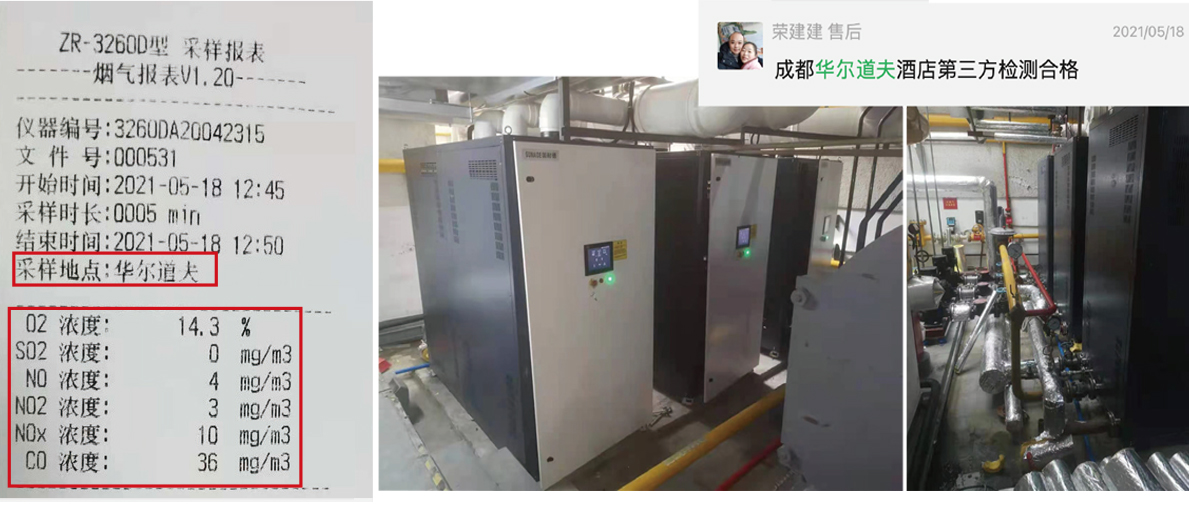 2020年11月,酒店采购我司3台型号为“RZQ1000-15”的冷凝式速能蒸汽机设备。设备连接洗衣房,主要为洗涤、消毒和烘干等工作提供高温蒸汽。客户对设备的排放进行第三方检测!检测效果非常理想!客户很满意!