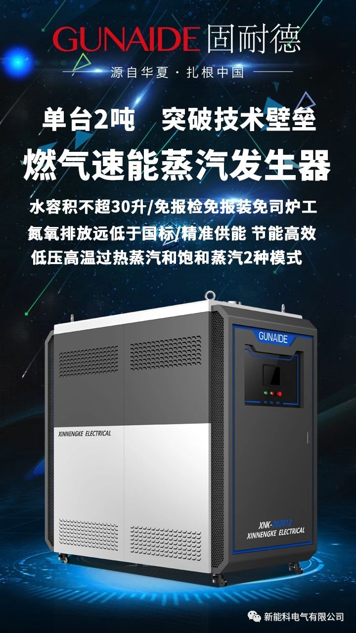 新能科今年新推出的单台2吨蒸汽发生器水容积不超30升(权威检测机构检测SDSEI/JGE-16-R02-3.01),免监检,安全可靠。自上市以来一直受到用户的热烈追捧,这款掀起行业热潮的产品,不仅可以替代传统锅炉,更是打破了蒸汽发生器行业的技术瓶颈,已成为众多行业传统锅炉改造的新方案。