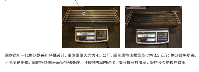 固耐德模块蒸汽发生器具有高效节能的优点。相较于传统的大型蒸汽锅炉,固耐德模块蒸汽发生器上层采用双层铜翅片式热交换器,是不锈钢材质的20倍;主热交换器双层,光管采用锅炉钢,翅片采用意大利进口合金钢换热效率是不锈钢的3倍,翅片布置紧密,换热效率更高,更加适合现代工业生产的实际需求。