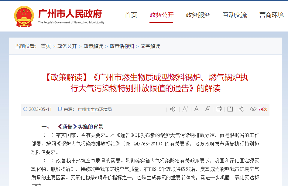 5月11日,广州市生态环境局发布关于广州市燃生物质成型燃料锅炉、燃气锅炉执行大气污染物特别排放限值的通告。规定广州市燃生物质成型燃料锅炉、燃气锅炉执行《锅炉大气污染物排放标准》(DB 44/765-2019)表3规定的大气污染物特别排放限值。
